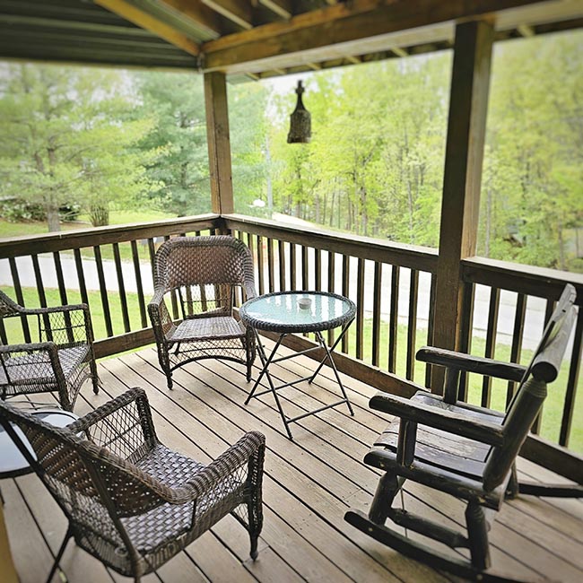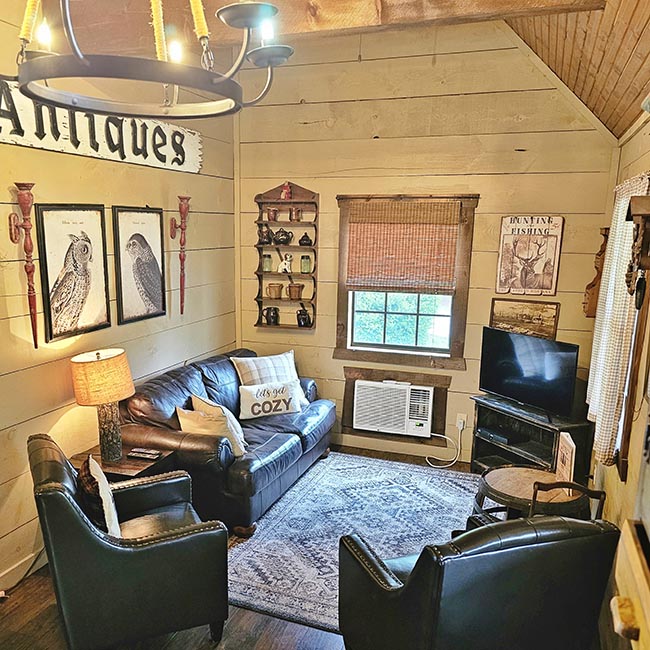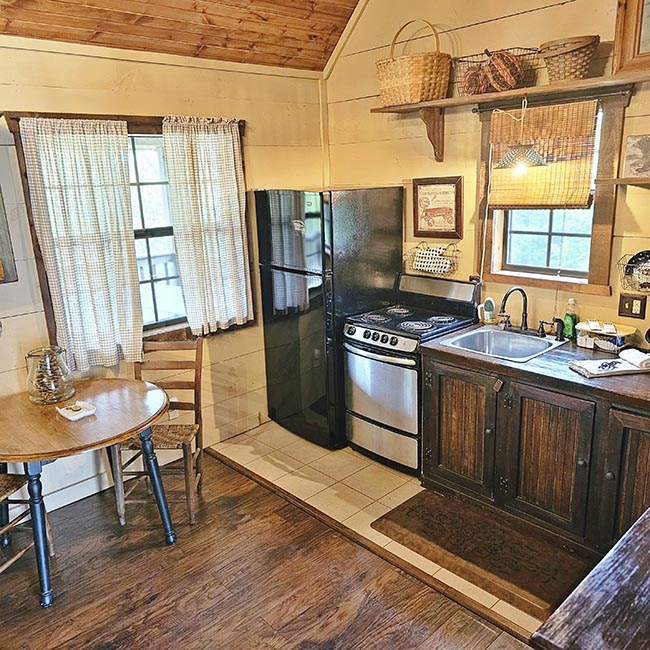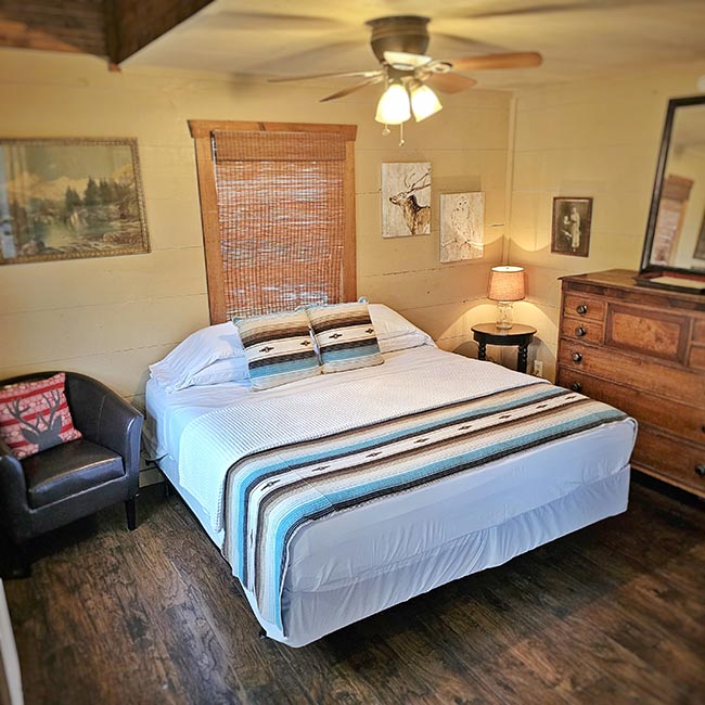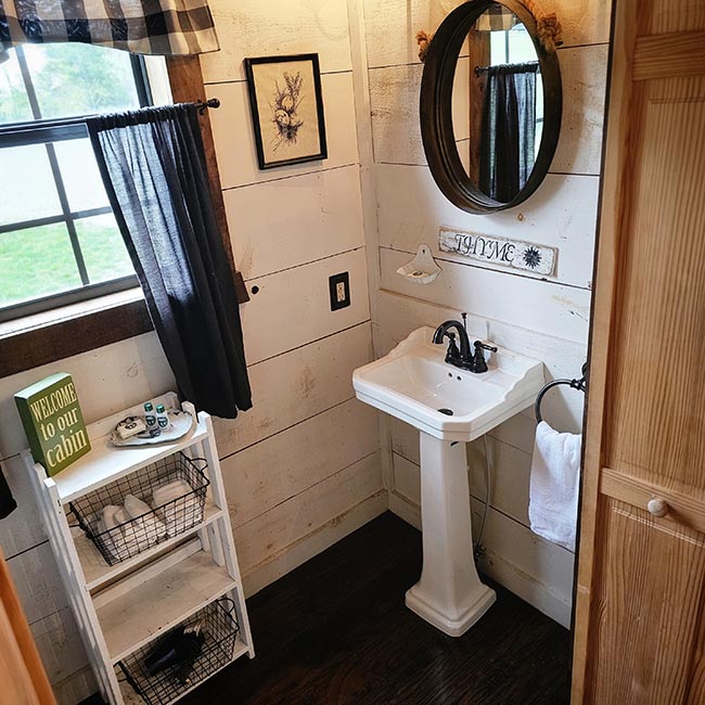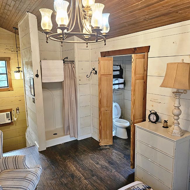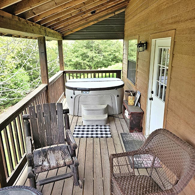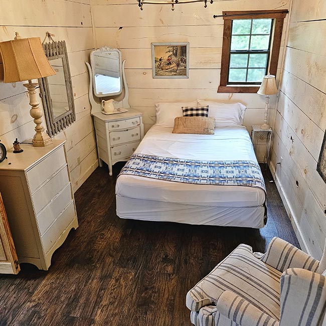 Pinecone Cabin The Pinecone Cabin RESERVE ONLINE NOW Pinecone Cabin– sleeps 2 – 4 guests (can sleep 6 with air-mattress provided by guests for kids only) 2 bedroom (King and queen bed); full kitchen; living room; 2 baths (shower/tub combo and shower); private hot tub. RESERVE ONLINE NOW